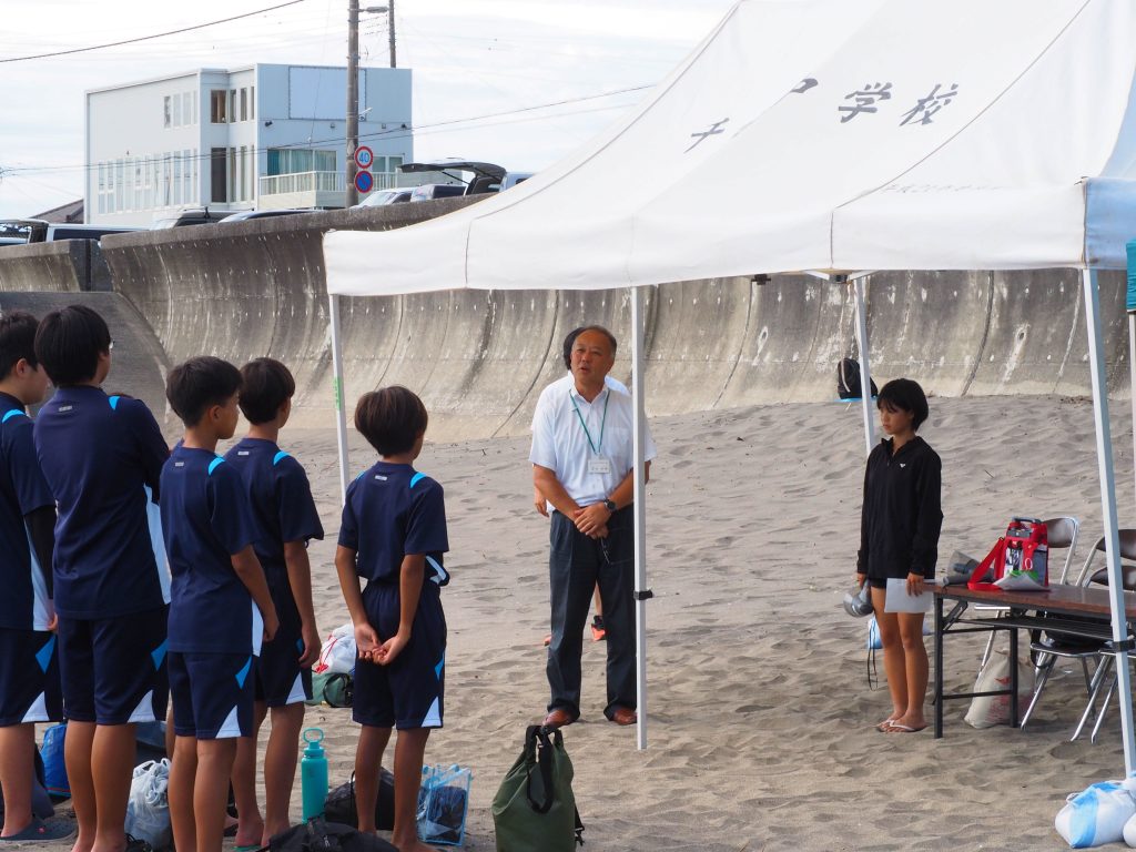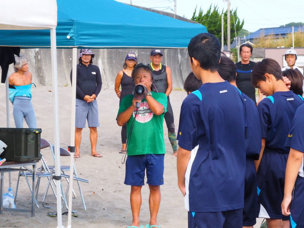 続いて、インストラクターのリーダーを務めた日本プロサーフィン連盟公認サーフィンインストラクターの鈴木国雄さんからも「私も旧千倉中の偉大な先輩です(笑)。今日はみんなで安全にサーフィンを楽しみましょう!」と挨拶が行われました。