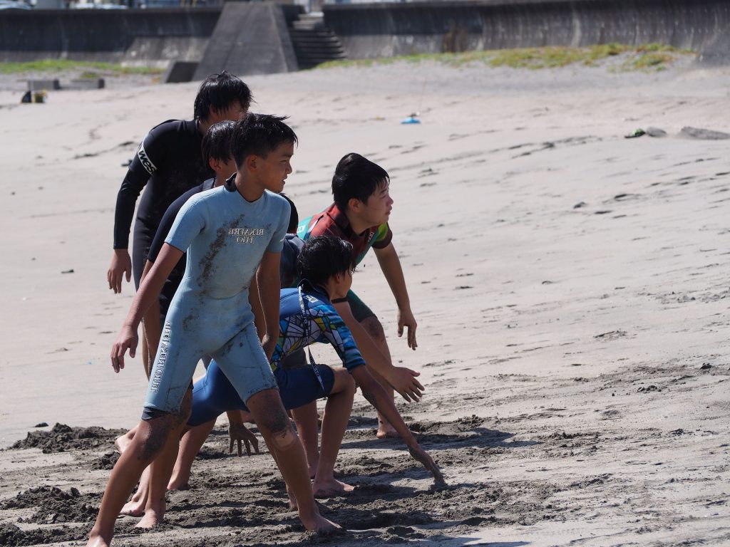 続いて、サーフィン体験がスタート。まずは砂浜で、パドリングやボードの立ち方など、基本的な動作を練習。その後、3つのグループに分かれて海に入り、サーフィン体験を行いました。