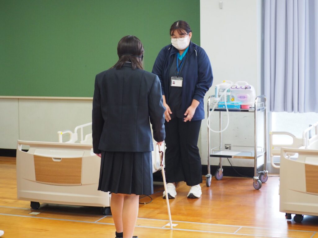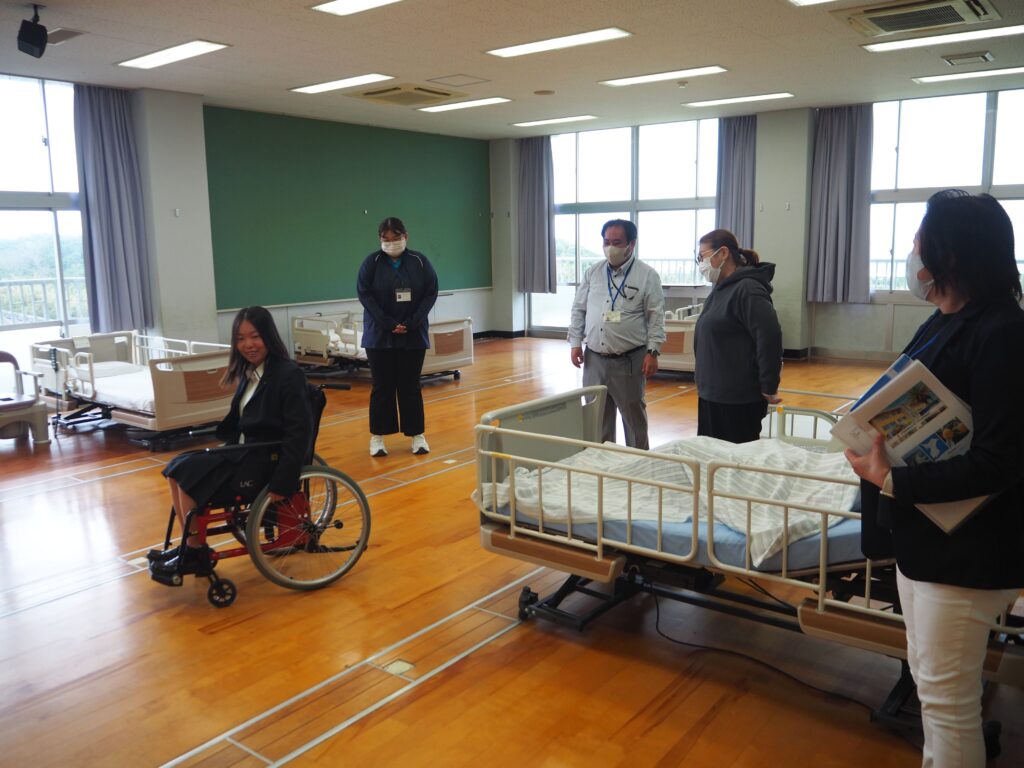そして最後はオープンキャンパスのメイン会場である3階へ。ここでは入学希望者向けの学校説明会や普段座学を行う教室の見学、介護体験が行われました。