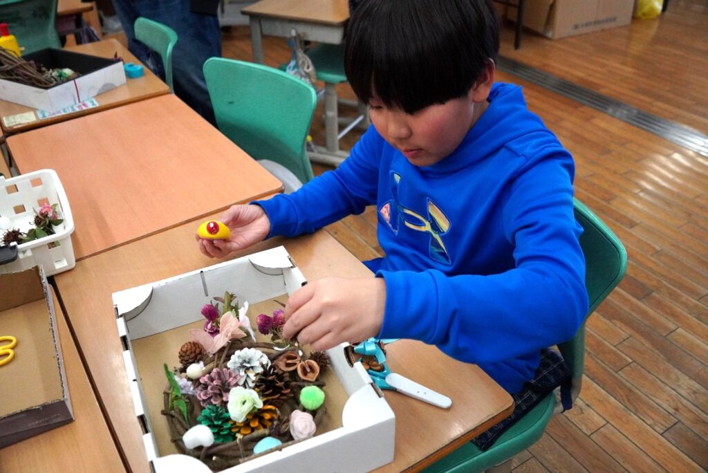 1~4年生は南房総の自然を生かしたワークショップが行われ、思いを込めて作品作りに励む様子が見られました。