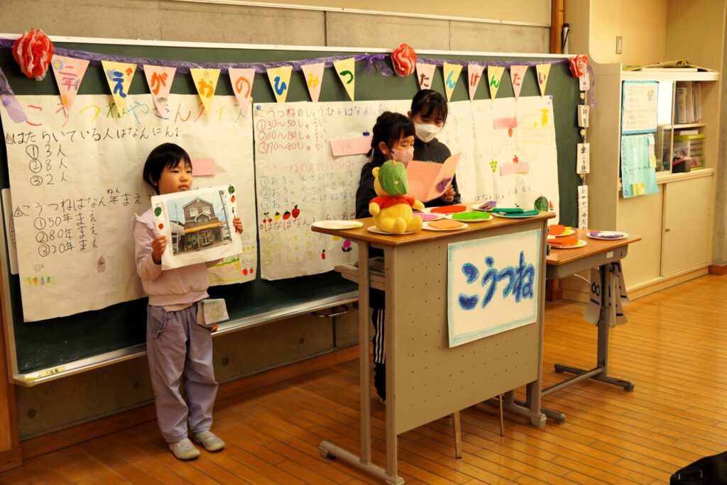 南房総学とは、「南房総に残っても、離れても、どこへ行っても支えとなる、故郷への誇りと強い思い」を育む地域学習です。学年ごとに発表や掲示、体験コーナーなど、南房総学で学んだことの成果が発表されました。子どもたち同士はもちろん、他学年の児童や保護者に向けて、緊張しながらも自信をもって発表する姿が見られました。