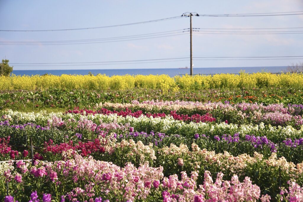 南房総市千倉地区の花畑では、色とりどりの露地花が見頃を迎えています。毎年1月から3月にかけて、ストックやカレンデュラ(キンセンカ)、キンギョソウ、ポピー、菜の花など、さまざまな花々が咲き乱れ、春の訪れを感じさせてくれます。