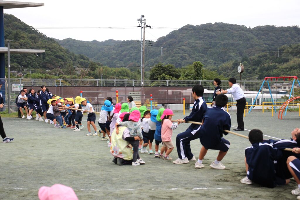 「小学校の行事予定を共有してもらっていて、縄跳び大会やマラソン大会などの応援に行くこともあります。春には小中学校合同の運動会に幼稚園が参加し、秋には幼稚園と保育所合同の『運動会ごっこ』という行事を実施しています。『ごっこ』という名前には理由があって、春の運動会で小中学生のかっこいい姿を見た幼稚園の子どもたちが、“あんなふうになりたい”と憧れを持ち、秋の運動会でその姿を真似して頑張るんです。小中学生も、幼稚園の子にかっこいいところを見せたいと張り切るので、お互いに良い影響があります。異年齢での関わりはとても貴重だと思います」