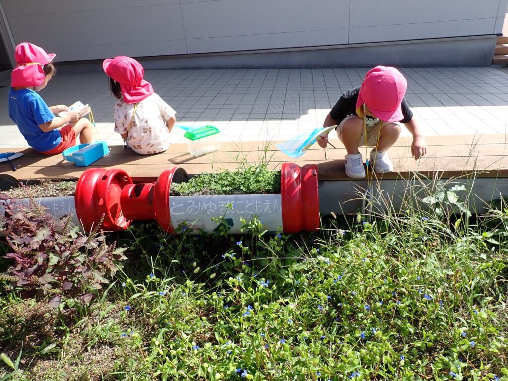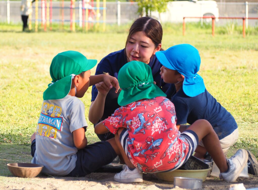 「今年度は『自然とのかかわり』を大切にしています。園庭はあえて整えすぎず、雑草をそのままにしたり、砂場以外の場所を自由に掘り返すのもOKにしています。草があると虫が来たり、花が咲いたり、地面を掘りっぱなしにしていると水たまりができたりします。園外にも自然はありますが、園庭で自然が感じられるところも良いと思っています。自然が近くにあることで、ツユクサの花で作った色水がとてもキレイなことや、どんぐりを埋めたら芽が出てきたりと、子どもたちは思い出に残るような出来事も増え、興味や関心が広がります」
