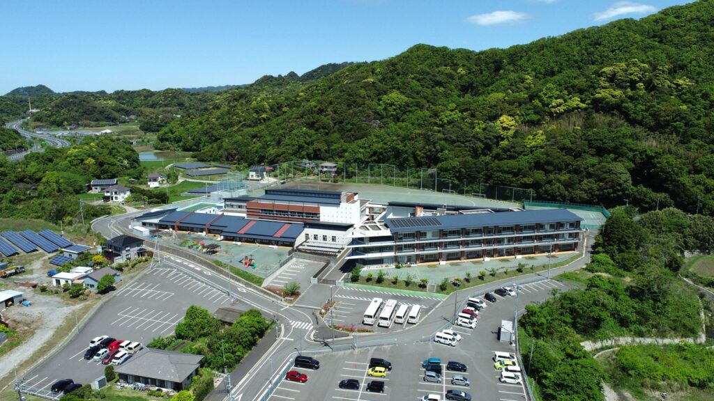 保幼小中施設が一体型の富山学園(左側が子ども園、右側が小中学校)
