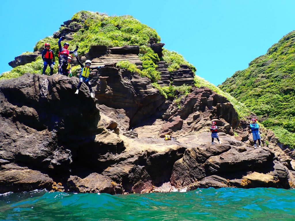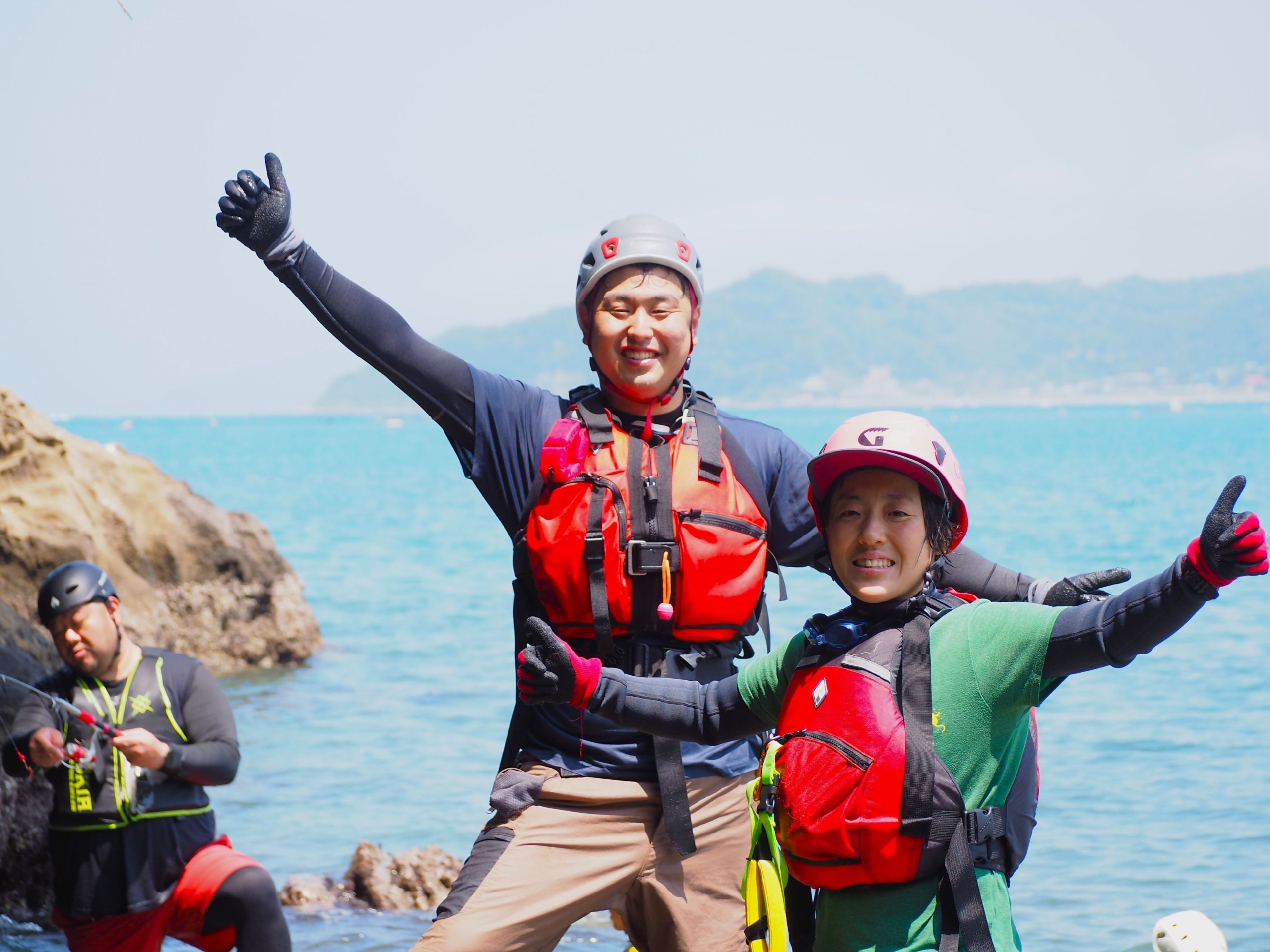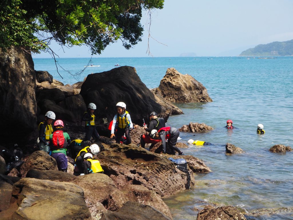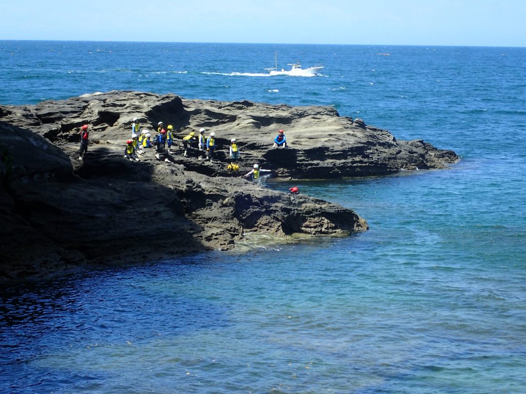 夏に人気があるプログラムの一つは、「海岸線を攻める!!コーステアリング」です。小学3年生以上の子どもたちで、海岸線の岩場を突き進み、海へダイブ。飛び込む瞬間は怖くても、勇気を出して飛び込んでみたら最高の笑顔に包まれます。