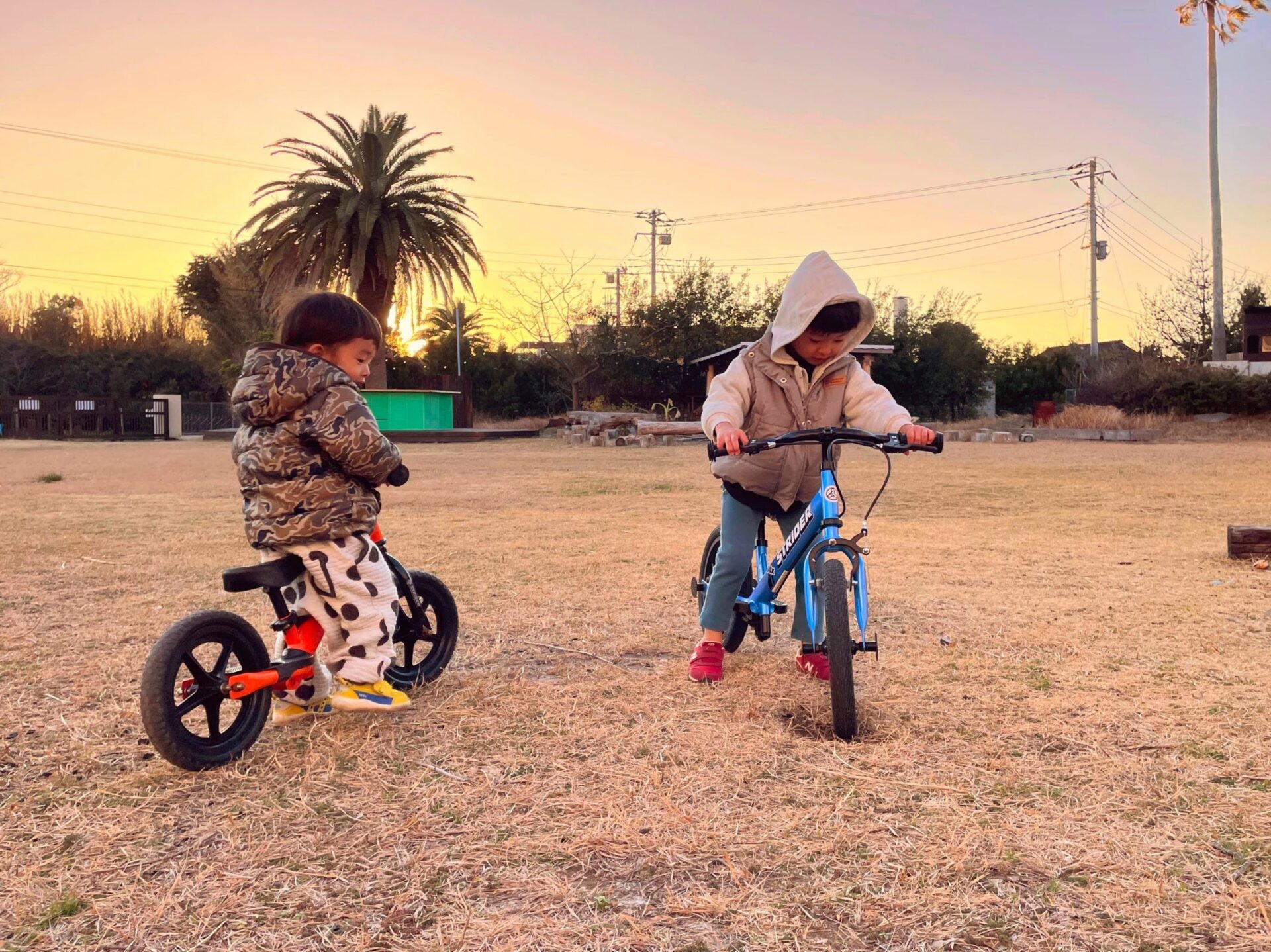 穴が気になる兄とそれを見つめる弟 強風の中でも元気いっぱい