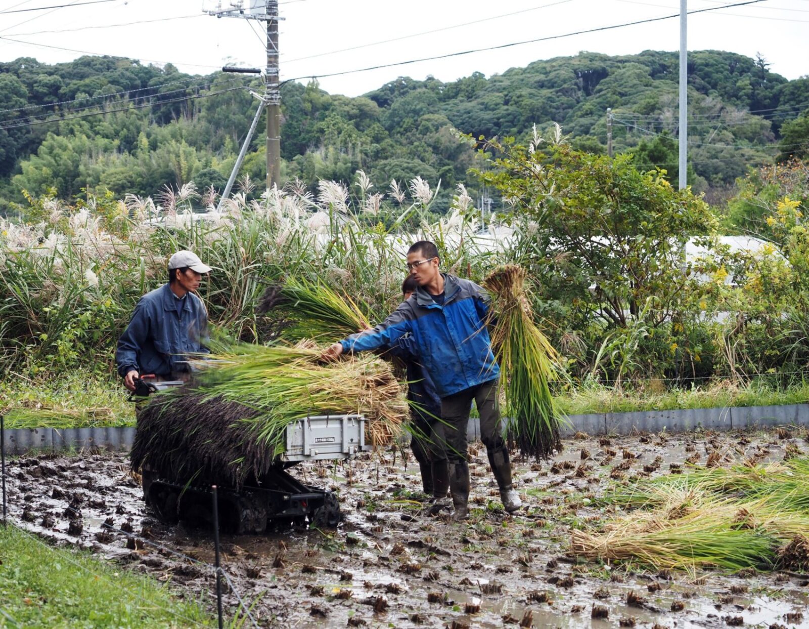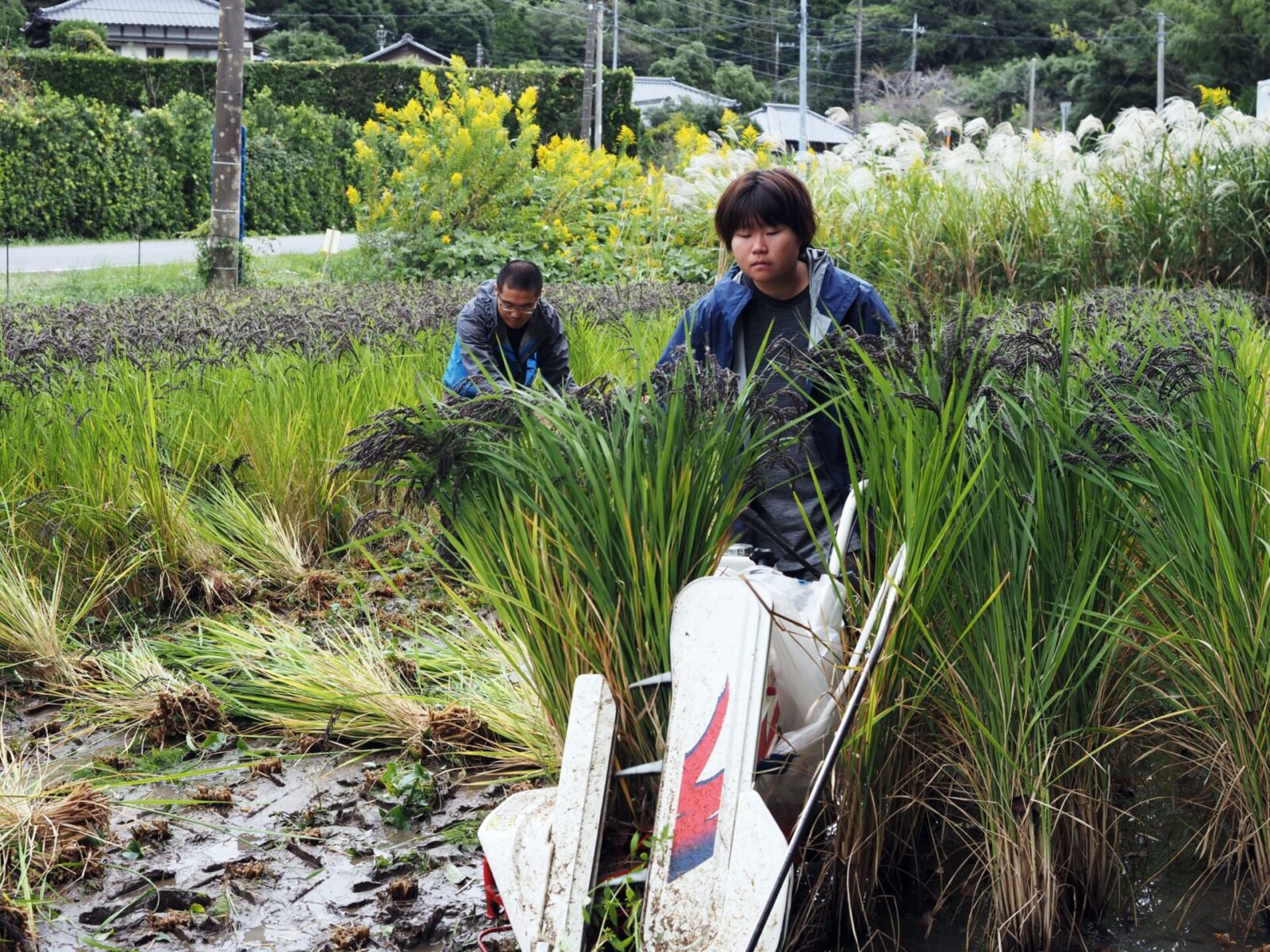 【八木さん指導のもと、緑米の収穫作業に励む齋藤さん夫妻】